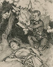 Herbert Beerbohm Tree (1852-1917) produced the most elaborate Shakespearean productions of the late nineteenth century, and though he was shunned by the critics when he took on leading man roles like Hamlet, Hotspur, and Macbeth, the public adored him and clamored to see him in almost anything he did as long as he produced the spectacle for which he was renowned. He was a character actor without peer, and was acclaimed in roles like Svengali in Trilby, Falstaff, King John, and especially as Nick Bottom in his legendary production of A Midsummer Night's Dream in 1900. Beerbohm Tree greeted the new century with his most lavish and famous production, with scenery that included massive columns in Theseus's palace, an enchanted forest with seemingly acres of flowers and real trees stretching to the back of the stage, and a legion of extra fairies played by children. Beerbohm Tree took center stage in his most famous Shakespearean role as Bottom, and was so popular with his devoted audience that the production ran 153 performances. He revived it for years afterwards, most famously in 1911 when live rabbits appeared following trails of bran around the stage.
