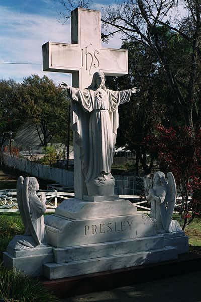 The tour of Graceland ends at the King's grave. This marble statue tastefully points the way.