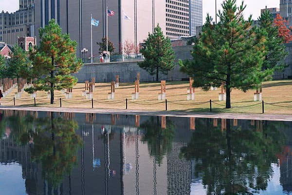 The 169 chairs represent the 169 people who died in the explosion. Each chair is individually cast, so that no two are alike.