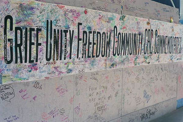 This graffitti was written by people who came to see the WTC site. Words of compassion flow from the pens of people from all over the worls.