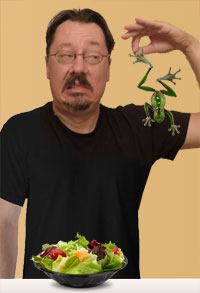 Thursday's lunch. Every day for lunch I make a healthy salad that has as its base fresh, delicious spring mix from a prominent warehouse store. Yesterday when I emptied some of the tasty greens into my salad bowl, I found some additional protein: a dead frog. I initially assumed that the frog's presence was due to some lackadaisical quality inspection by the third world laborers who harvest the foliage for my nutrition, then I began to wonder what the frog's dire situation was that it was willing to risk death hidden in a box of organic baby lettuces, spinach and arugula to find life in a new part of the country. I looked at the packaging that the spring mix came from and saw that it was a product of Santa Maria, California, which until yesterday I had never realized was an oppressive political regime for frogs. I only hope that any future frogs who enter my part of the world to escape Santa Maria's repression will remember the sacrifices of this tiny toad and say a prayer for him as they breathe the sweet air of freedom.