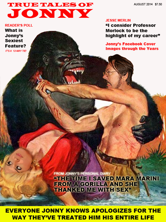 True Tales of JonnyBetween my trip to San Francisco earlier this week to my preparing to open in Three Really Offensive Scenes About the Founding Fathers (part of Eclect-a-Fest) next Thursday, I didn't have time to crap out my regular list this week. I know how important these pages are to your barren lives though and I didn't want to leave you complete hanging, so Mad Beast International is excited to announce the premiere of True Tales of Jonny Magazine.The periodical recounts actual stories from my life, such as the premiere issue which describes the time I saved Mara Marini from a gorilla and she thanked me with sex. Future issues relate such Jonny anecdotes as the occasion I dubbed the singing of Jonny Award winner Jesse Merlin when his voice was deemed just not good enough, the time I saved Mara Marini from a herd of stampeding rhinos and she thanked me with sex, when Bro Joe came crawling to me on his hands and knees to tell me how inferior he is to me in every way, the time I saved Mara Marini from a gang of attacking ninjas and she thanked me with sex, how my nemesis Misty LaRue decided to take a vow of silence and swore never to utter another word, or the time I saved Mara Marini from an invasion of Nazi storm troopers and she thanked me with sex. All of these stories are told exactly as I remember them after a week of binge drinking and forgetting to take my medication.Look for the premiere issue of True Tales of Jonny on your newsstands soon. In the mean time, don't forget to buy your tickets to see me in Eclect-a-Fest. Especially Mara Marini. I expect that she'll enjoy it so much that she's going to thank me with sex. |