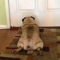 Pain in the ass Tom Ashworth, who is doing his best to topple Jesse Merlin's place as my #1 enemy of the year. I left my beloved pug Winston at the home of my nemesis Misty LaRue during my recent trip to San Francisco, and when I walked out the door Ms. LaRue immortalized this image of Winston waiting breathlessly for me to come back to him. I made the mistake of posting the picture on Facebook (the social networking site on which I am the sexiest man) and Mr. Ashworth responded "She had to drug the dog, then drag him to the door to look like he was missing you." Mr. Ashworth has a lifetime of employing drugs to manufacture the appearance of emotions that he is too dead inside to genuinely feel, so I can forgive him that bit of wise-assery. What gets him on the list is trying to redeem himself by adding "My Grandfather's dog Shep starved himself to death after Pop Pop's death, it broke my Grandmother's heart again...I was there." If you look at Winston's enormously fat ass, you'll immediately realize that he's not going to miss a meal for any reason and if I was to drop dead in front of him, he would eat my face and genitals before the neighbors even began to notice an unusually foul stench coming from beneath the door jam (as opposed to the usual foul stenches they notice every day). I suppose that's a good thing because at least the tiny handful of people who mourn my death won't also have the additional tragedy of Winston kicking the bucket from malnutrition to deal with. With all the chemicals I pump into my genitals to try and get them to work, there have got to be some vitamins mixed in there somewhere.