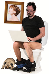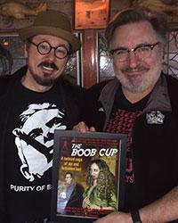 Glenn "Piece of Shit" Simon, with whom I brunched on Super Bowl morning. 2017 started out fantastically with my not laying eyes on Mr. Simon for a couple of months but our Sunday meeting allowed me to finally present him with his Christmas gift from last year: a framed cover of the Hack Werker penny dreadful entitled The Boob Cup, a novella which is loosely based on Mr. Simon's life. Mr. Werker is the author for whose work I famously provide the cover art and while I find it always takes a strong stomach to skim his narrative for illustration ideas, this one was especially hard to get through. The story depicts Mr. Simon taking residence in an apartment in the same building as a gorgeous young woman who become sexually obsessed with him. Tragically, her feelings are not returned because Mr. Simon's affections are directed only at the porcelain mammary gland of the title, leading her to a series of graphically-depicted sleazy and unfulfilling sexual escapades with characters who bear an uncanny resemblance to the author Hack Werker (this is a hallmark of all of Mr. Werker's writings), making her feel more worthless and self-loathing than ever (which I'm told is a common trait among Mr. Werker's sexual companions). Her longing for Mr. Simon ultimately drives the heroine into a suicidal despair in which she plots revenge against the cup. This leads to the finale showing Mr. Simon, the heroine and the cup atop the Golden Gate Bridge (the only sequence in the book which could be described as remotely interesting) in which she threatens to shoot him, the cup, herself, or possibly all three unless he proclaims his love for her. The cup finally dispatches its rival by pouring some of Simon's life-sustaining alcohol that it carries onto the bridge's pavement, causing the heroine to slip and fall to her death in the San Francisco Bay. It's all highly implausible, fiercely self-indulgent and ultimately pretty boring. It really captures Mr. Simon's essence.