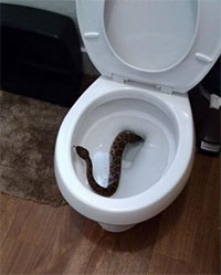 The increasingly annoying Lisa Glass, who posted an article from the Washington Post, no less, saying that a boy in Texas found 23 rattlesnakes inside his toilet. I have always found going to the bathroom to be a terrifying experience under the best of circumstances. Now that I have Ms. Glass to point out to me that there's a strong possibility that deadly vipers will assail my anus as I'm dropping the kids off at the pool makes me inclined to want to hold in any bowel movements until I explode. It will be messy death but anything's got to be better than sitting on a toilet waiting to be surprise-attacked from below by venomous reptiles. My only hope would be if the snakes made their assault after I had visited Mr. Frierson's house for a meal of deep-fried possum. Only then would I have the ammunition to launch a counter-attack that would make those slimy bastards regret the day they'd been born.